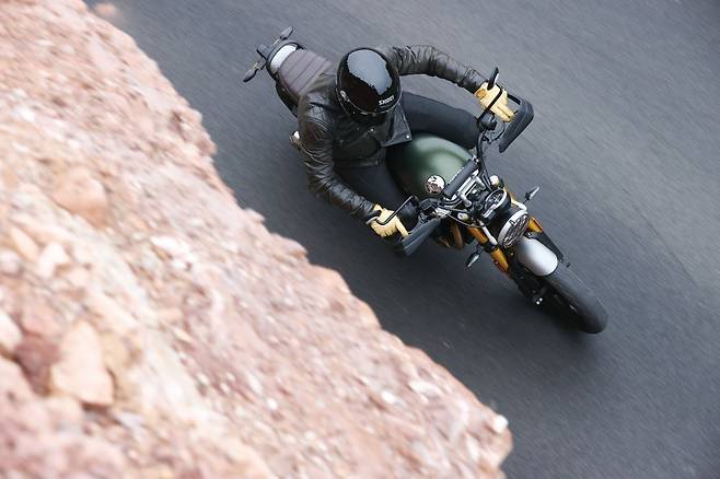 전후 17인치 휠에 타이어는 메첼러 스포텍M9이 기본 장착된다. 고성능 도로용 타이어로 꽤 본격적으로 스포츠 주행에 대응하고 있음을 드러내는 부분이다. 그리고 트라이엄프가 코너링에 진심인 브랜드라는 것은 지금까지 수많은 트라이엄프 바이크를 경험하며 공통적으로 느낀 점이다. 이른 아침의 쌀쌀한 기온에 타이어 온도가 오르기 전까지만 살살 달리고 그 이후로는 코너 탈출마다 풀스로틀로 열어가며 탔다. 스페인 발렌시아 인근에는 고불고불한 산길이 널려있는데 스피드 400에 딱 맞는 테스트 코스였다. 회전반경이 좁고 민첩해 타이트한 헤어핀 코너를 만나도 부담이 전혀 없다. 서스펜션 성능도 인상적이다. 쇼와제 43mm 빅피스톤 도립식 포크를 기본으로 장착하고 있다. 조금은 오버스펙이 아닐까 생각했지만 의외로 스포츠 주행성능에 맞게 쫀쫀하게 잡아주는 서스펜션의 느낌이 만족스러웠다. 전후 무게 밸런스도 절묘해서 두 타이어의 그립을 고르게 써서 돌아가는 느낌이 주행의 안심감을 더한다. 싱글디스크에 바이브레 캘리퍼의 조합은 만족할 만한 제동성능을 보여준다. 주행 스타일에 맞춰 더욱 공격적인 성향의 브레이크 패드를 넣었다고 한다.