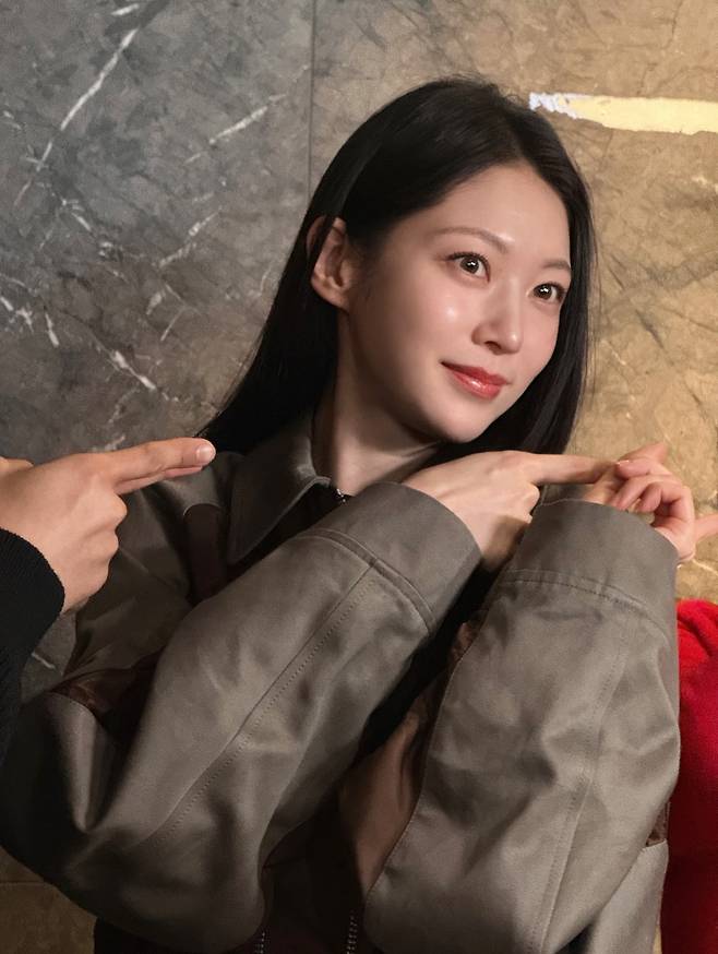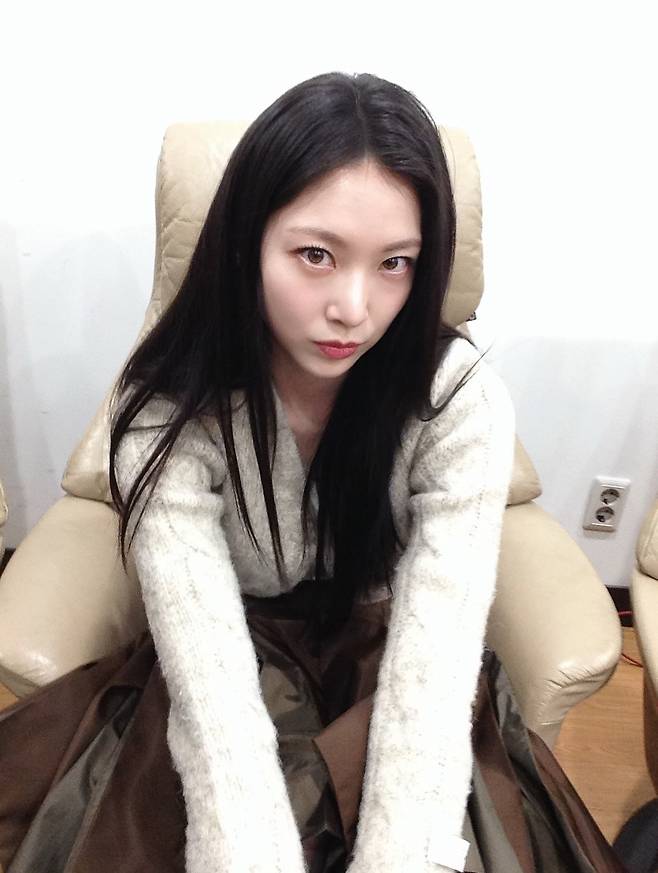 공승연은 부드러운 베이지 톤의 크롭 가디건과 딥 브라운 스커트를 매치하여 따뜻하고 차분한 감성의 데일리 룩을 연출했습니다.