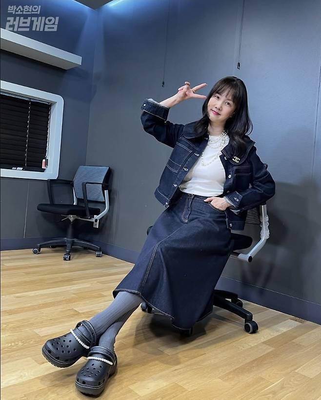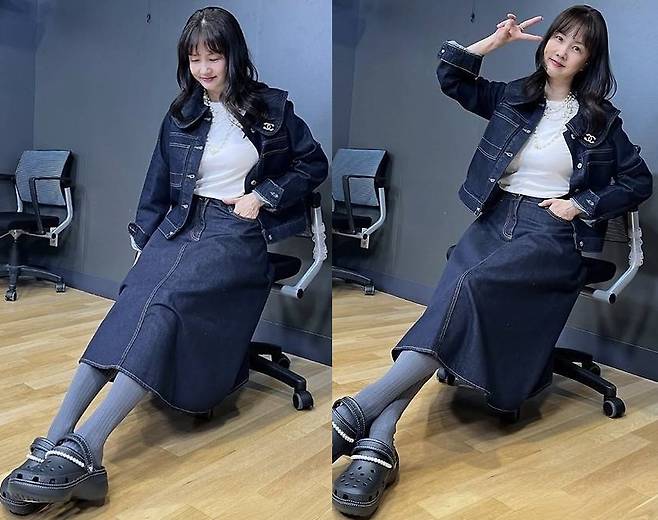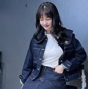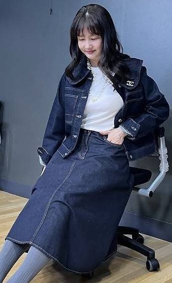 박소현은 짙은 인디고 컬러의 데님 재킷과 롱스커트를 매치한 셋업 패션으로 단정하면서도 캐주얼한 분위기를 연출했습니다.