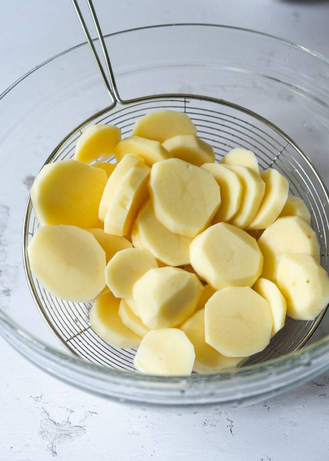 1. 감자는 껍질을 벗겨 큼직하게 썰어 찬물에 5분 담가 전분기를 뺀 뒤 물기를 뺀다.