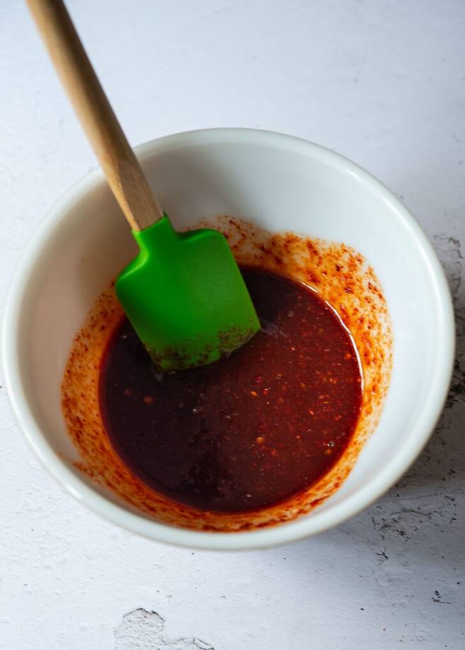 3. 볼에 고추장·고춧가루·간장·맛술·물엿·다진 마늘을 섞어 양념장을 만든다.