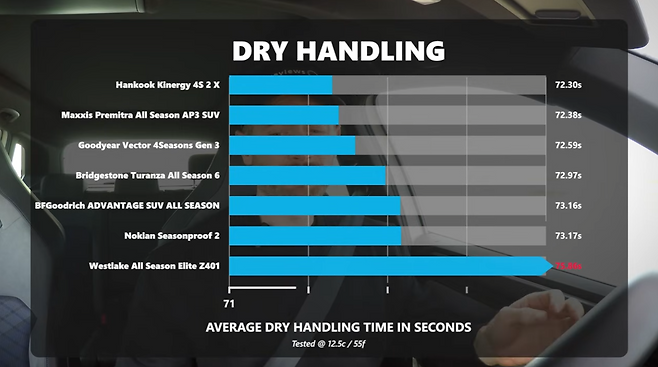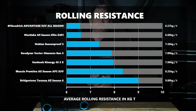 웨스트레이크는 승차감이 적당하고 저저항 롤링 특성(연비·EV 항속거리 개선에 중요)을 갖췄음에도 최하위에 머물렀다.