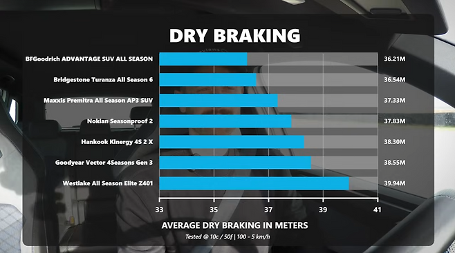 시험 결과, 브리지스톤은 6위, 맥시스 5위, 한국타이어와 굿이어가 공동 3위, BF굿리치가 2위를 기록했다. BF굿리치는 마른 노면 제동 성능에서 가장 뛰어났으며, 수막 저항성, 눈길 주행 성능, 소음·승차감, 롤링 저항성(최고)도 우수했다. 다만 젖은 노면 제동과 코너링에서 약간의 언더스티어가 아쉬웠다.