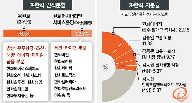 한화그룹의 지주회사 격인 ㈜한화가 방위산업·조선·해양·에너지·금융 부문이 속하는 존속법인과 테크·라이프 부문이 속하는 신설법인으로 나뉜다. 김승연 그룹 회장의 삼남인 김동선 한화호텔앤드리조트 부사장을 위한 계열분리의 발판을 마련한 것으로 풀이된다.