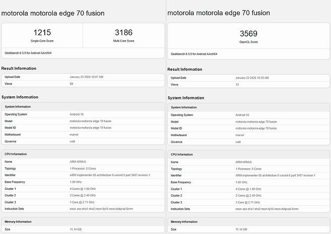 현재 모토로라는 Edge 60과 Edge 60 Pro를 사실상 대체하는 Edge 70 모델만을 선보인 상태인데요. 하지만 최근 두 건의 Geekbench 벤치마크 등록 정보가 포착되면서, Edge 60 Fusion의 후속작이 준비되고 있다는 정황이 더욱 뚜렷해졌습니다.