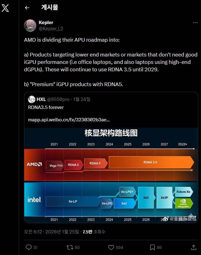 X(구 트위터)에서 활동하는 유명 팁스터 Kepler_L2에 따르면, AMD는 고성능 iGPU가 필요하지 않은 제품군에 한해 RDNA 3.5를 계속 활용할 계획이라고 합니다. 예를 들면 사무용 노트북이나, 이미 고성능 외장 GPU가 탑재된 시스템들이 여기에 해당합니다. 다시 말해, iGPU 성능이 상대적으로 덜 중요한 영역에서는 굳이 최신 아키텍처를 서둘러 적용하지 않겠다는 전략으로 보입니다