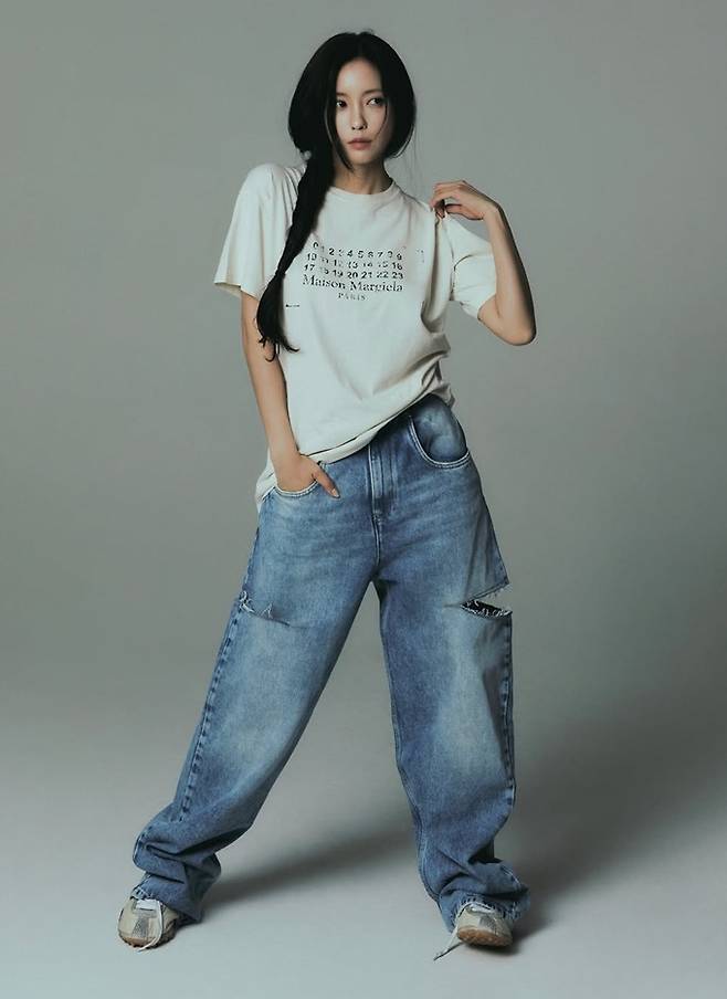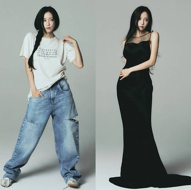 공개한 화보 컷에서 효민은 찢어진 청바지에 레터링 티셔츠를 착용한 힙한 모습과 블랙백리스 롱 드레스로 고혹적인 여성미를 드러내며 매력 만점 여름 스타일을 선보였다.