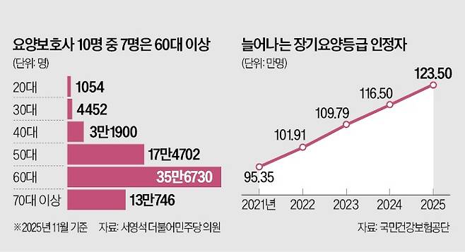 돌봄 현장도 덩달아 늙어가고 있다. 지난해 11월 기준 활동 중인 요양보호사 중 60대가 51%(35만6730명)로 절반을 넘었고, 70대 이상도 18.7%(13만746명)에 달했다. 저임금과 고강도 노동 기피 현상으로 20대는 0.15%(1054명), 30대는 0.64%(4452명)에 불과했다. 노인을 돌보는 인력이 고령층에 집중된 구조가 고착화되고 있는 것이다.