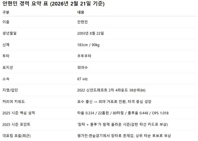 연습경기 첫날, 몸이 무겁고 타이밍이 늦는 선수들이 흔한 시기다. 그런데 안현민은 초반부터 공을 정확히 맞혔고, 경기 뒤에도 “첫 경기치고 컨디션이 생각보다 좋았다”는 식으로 담담하게 정리했다. 과장된 자신감이 아니라, 타석 감각이 올라오는 게 느껴진다는 확신에 가까웠다.