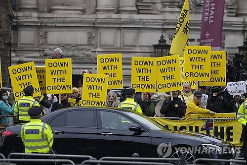Anti-monarchy protesters demonstrate outside Westminster Abbey watched by police before members of the Royal family arrive to attend the annual Commonwealth Day Service of Celebration at Westminster Abbey in London, Monday, March 11, 2024. Commonwealth Day is an annual celebration observed by people all over the Commonwealth in Africa, Asia, the Caribbean and Americas, the Pacific and Europe. (AP Photo/Kirsty Wigglesworth)