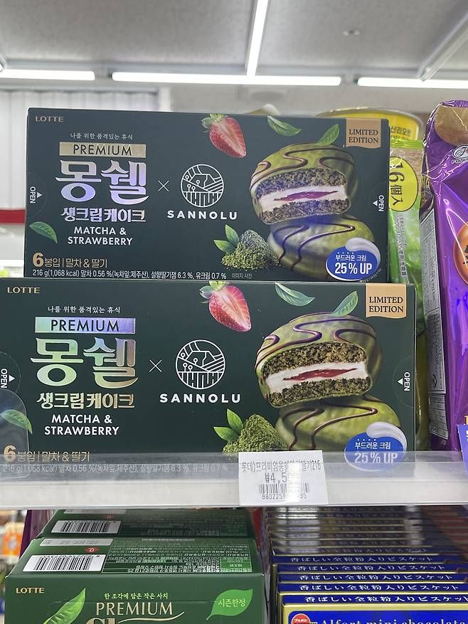 프리미엄 버전 몽쉘 브랜드의 첫 협업 제품으로, 제주산 유기농 말차 코팅 겉면과 설향 딸기잼이 들어간 생크림이 특징이에요.
