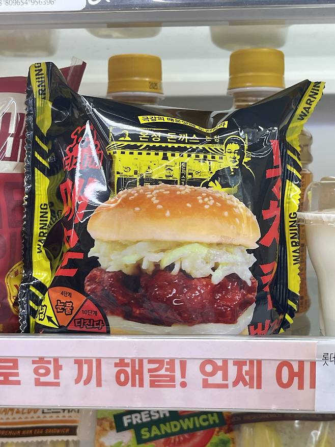 세븐일레븐이 온정돈까스와 협업해 출시한 매운맛 콘셉트 신제품으로, 통다리살 치킨패티에 매콤 양념 소스를 더한 버거에요.