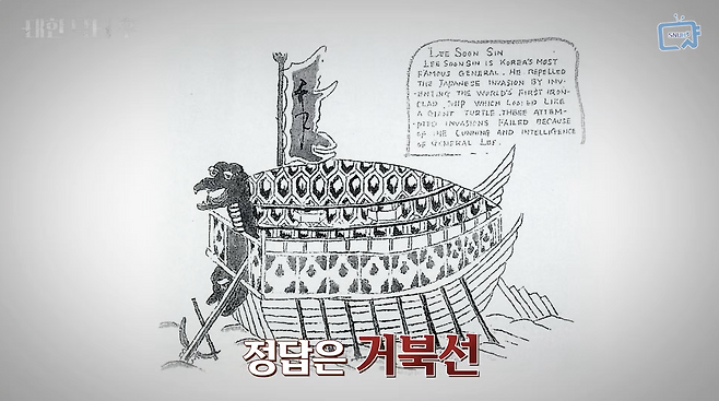 나는 도안에서 거북선이 국가의 적인 결액을 향해 발포하도록 대포를 배치했다