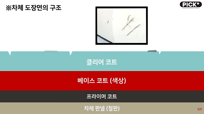 기본적으로 자동차면의 구성을 살펴보면 자체 판넬 부분(철판) 부분을 시작으로 프라이머 코트, 베이스코트(색상), 클리어 코트 순으로 구성이 되어있는데요, 차체 철판 위에 도장면과 클리어 층이 본판과의 공기 접촉을 막아주어 부식이 발생하는 것을 방지해 준다는 특징이 있습니다.