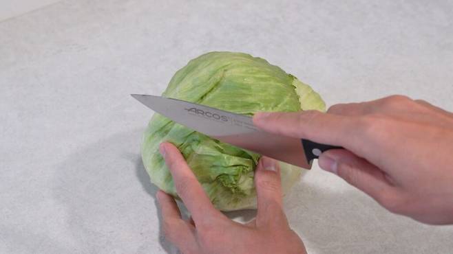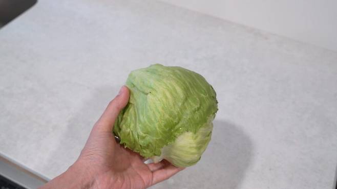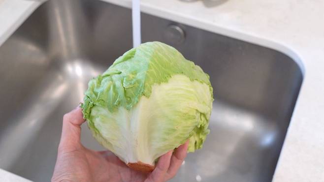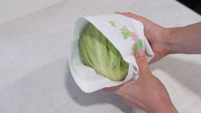 씻지 않은 상태에서 키친타월로 양상추를 감싸 주세요. 키친타월은 양상추 보관에 중요한 습도를 조절해 주어 빠르게 시들지 않도록 만들어 줍니다.