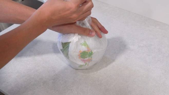 키친타월로 감싼 양상추는 다시 위생봉지에 넣어 주세요. 이때 공기는 최대한 빼고 봉지 입구를 닫아줍니다.