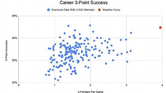 3점슛을 아무리 많이 성공시켜도 성공률이 떨어지면 공격 효율을 떨어트리는 주범이 될 수밖에 없습니다. 하지만 커리는 통산 3점슛 성공률 42.4%를 기록 중인데, 제임스 하든의 36.2%보다도 훨씬 높습니다. 통산 2,500개 이상의 3점슛을 성공시킨 선수들과 비교해 봐도 커리의 3점슛 능력은 '신계'라 봐도 무방합니다.