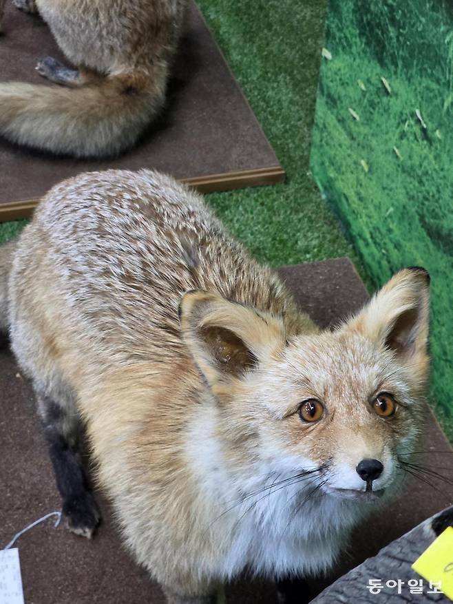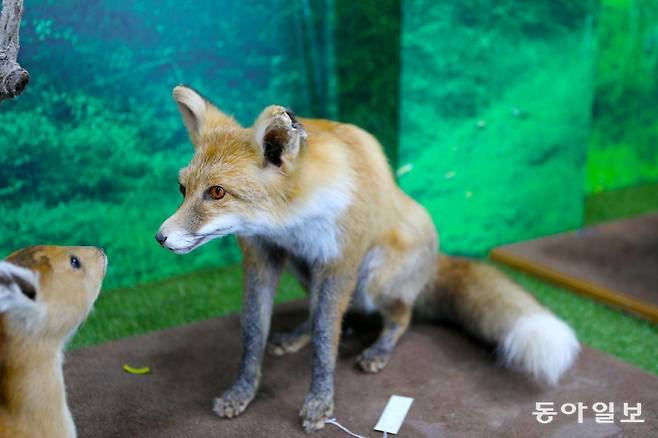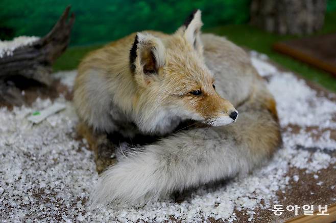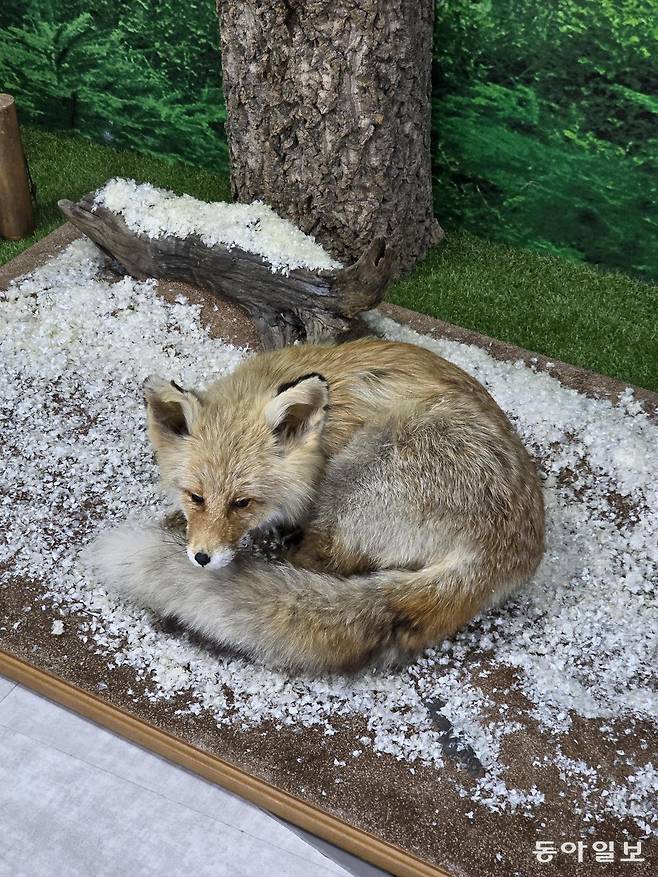 ‘여우생태관찰원’에 들어가면 먼저 죽은 여우를 살아 있던 모습 그대로 박제한 모습을 볼 수 있습니다. 여우는 개과 동물입니다. 하드웨어 몸집은 중간 크기의 개를 닮았습니다.