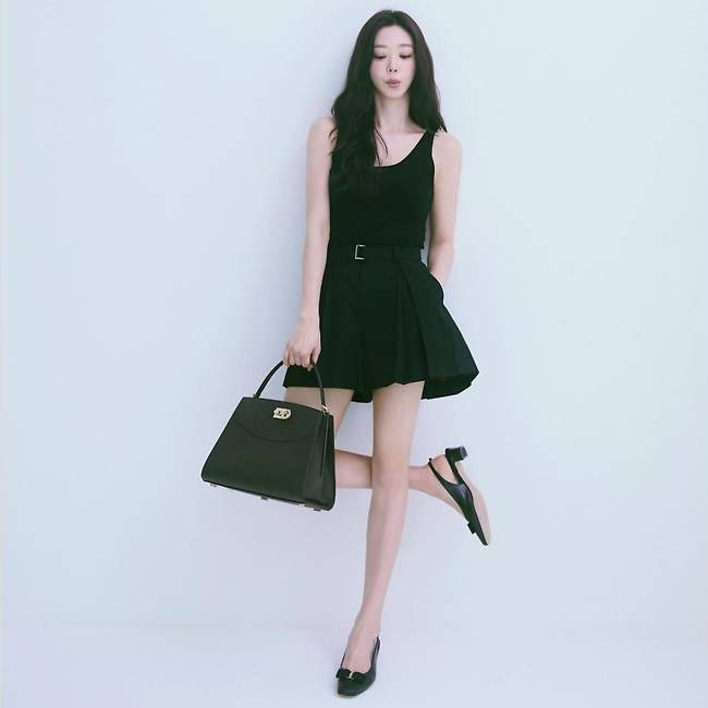 이주빈은 슬리브리스 블랙 톱에 플리츠 디테일이 더해진 블랙 미니 쇼츠를 매치해 심플하면서도 시크한 무드를 완성했습니다.
