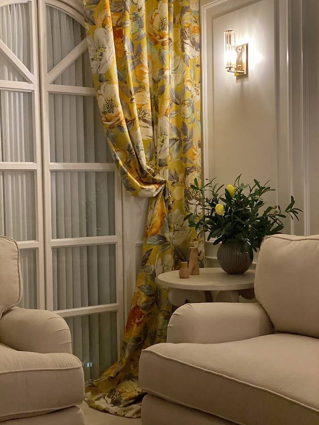 거실 벽 조명은 크리스탈&골드로 선택해서 깔끔하고 고급스러운 느낌을 연출해봤어요. 커튼은 플라워 패턴의 영국 수입 원단이라 집에 생기를 주는듯해요.