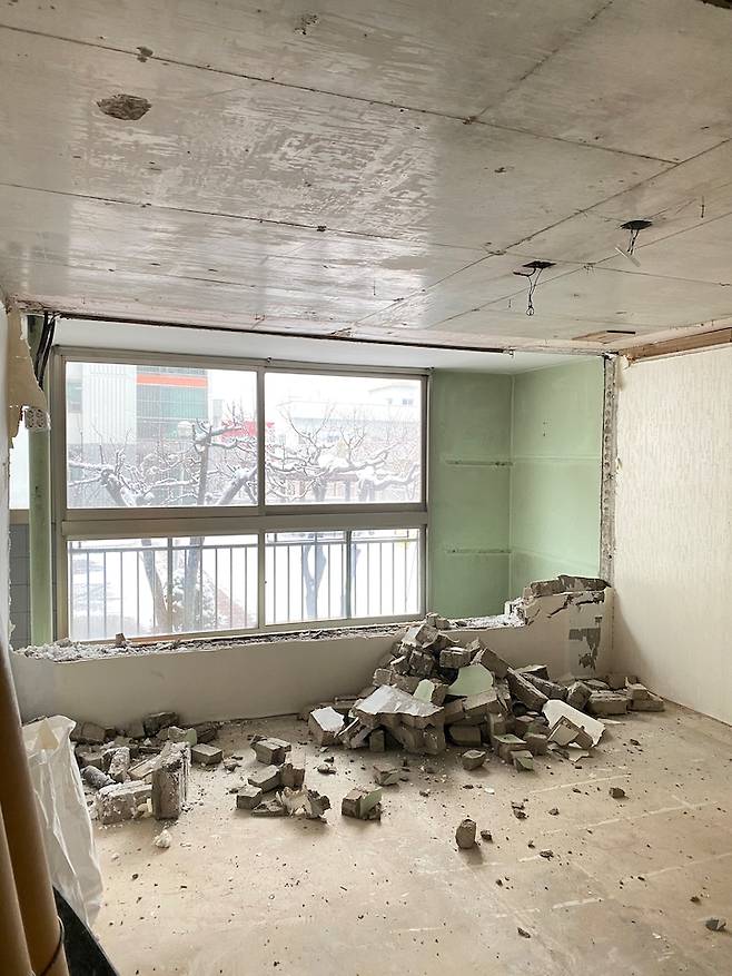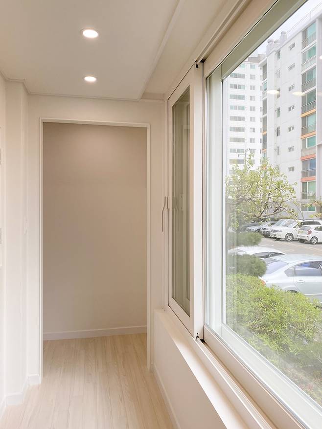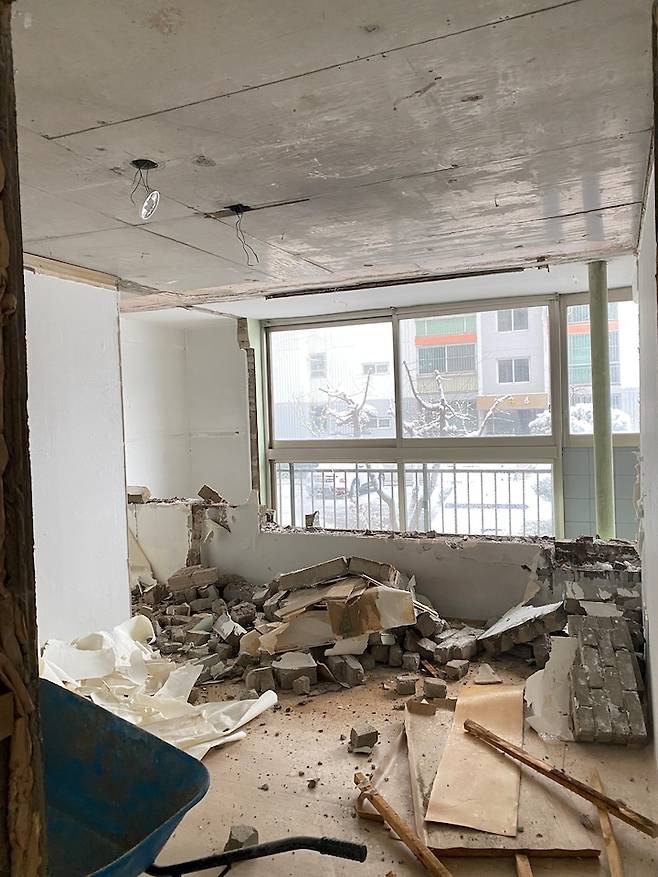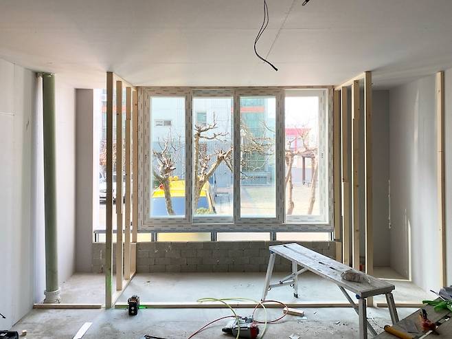 베란다와 방 사이의 벽을 허물고 목공을 시작했어요.샤시는 냉난방으로 고려하여 원래보다 작게 제작했어요. 아래쪽은 벽돌로 막아주고 바닥 쪽은 모두 충전재를 채워 넣었어요