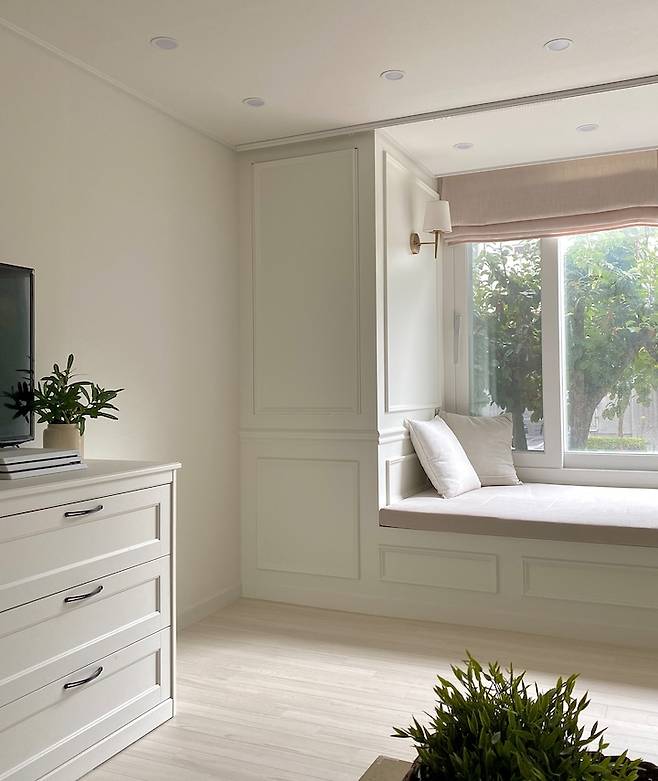 윈도우 시트에 바닥 쿠션이랑 로만쉐이드 맞춤해서 설치하고 조명도 달아주었어요. 여기에서 나뭇잎 보며 책 읽다가 낮잠 자는 게 저의 작은 소원이랍니다.