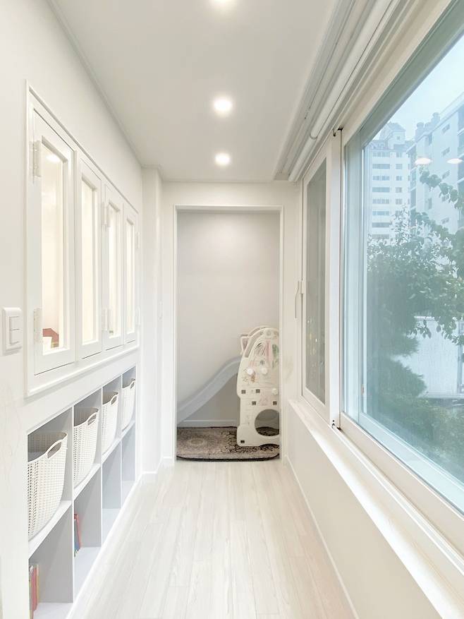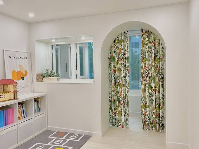 아이들 놀이방에 있던 수납장과 베란다 사이의 벽은 모두 허물고 가벽을 세워서 놀이 공간과 구석 아지트를 만들었어요.