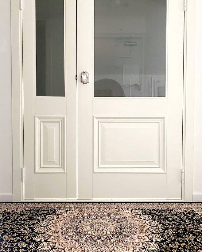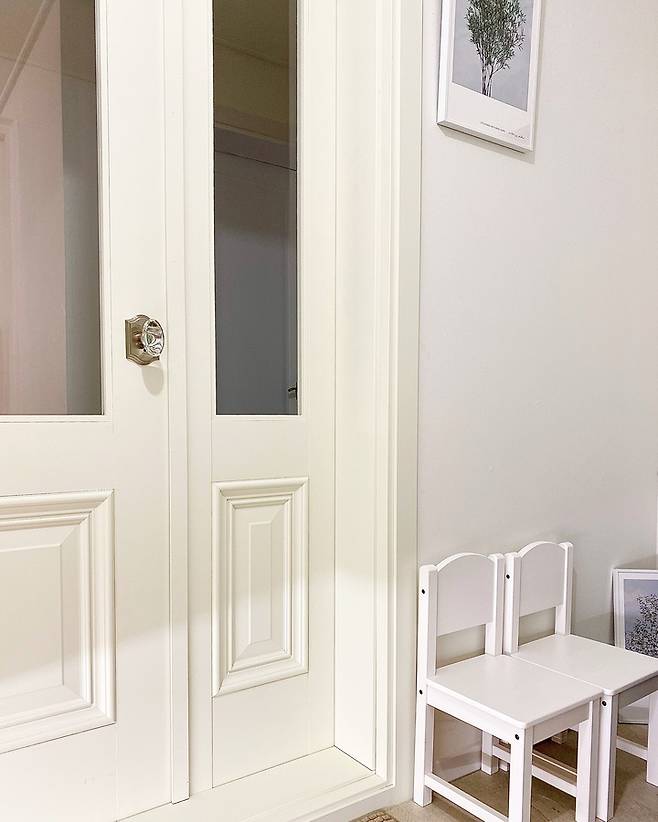 현관 중문은 멤브레인 형태의 문으로 선택했어요. 컬러는 크림 아이보리에요. 손잡이는 크리스탈로 따로 구입해서 달아주었어요. 그립감도 좋고 너무 예뻐서 잘 선택한 것 같아요.