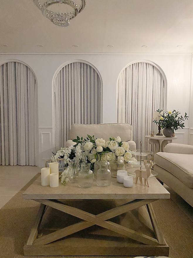 전체적으로 화이트인 거실에 다양한 커튼들로 분위기 전환도 해보곤해요.