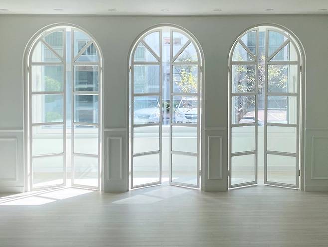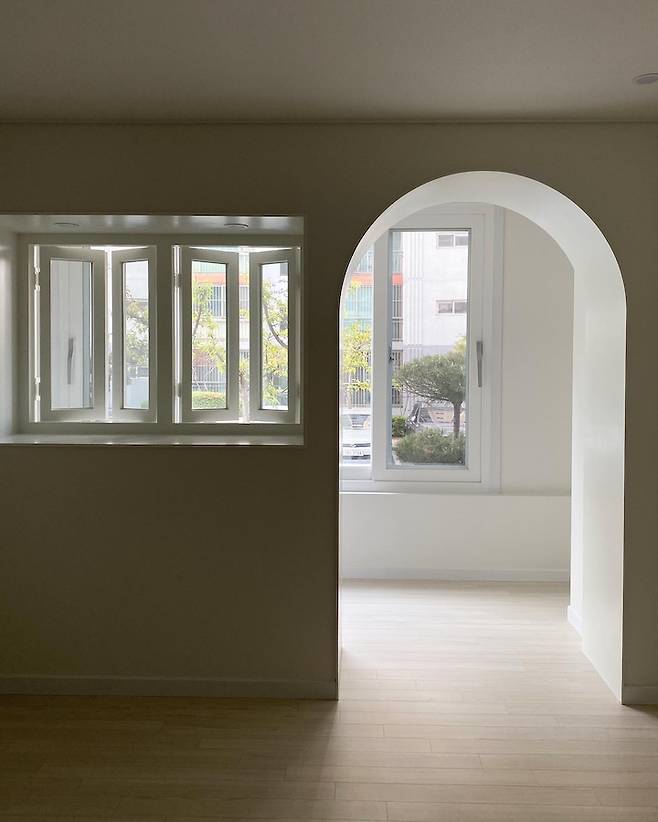 거실은 확장인 듯 아닌듯한 느낌으로 중간에 아치문 3개를 넣었어요. 다 열고 있어도 예쁘고 닫고 있어도 예쁘더라고요. 아치문의 유리는 강화유리로 넣었어요. 모든 샤시의 이중유리는 투명/투명으로 했어요. 보통 투명/그린으로 되어있어서 창문 쪽 사진 찍으면 더 푸르등등하게 나오더라고요. 투명/투명으로 했어도 아예 푸른빛이 없진 않네요.