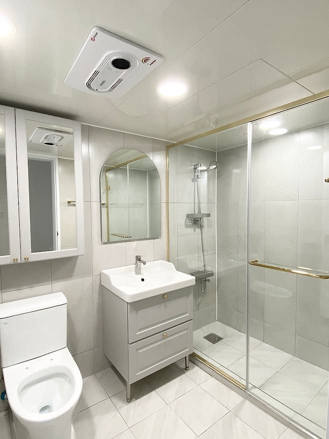 욕실 환풍기는 환기뿐만 아니라 온풍, 냉풍, 헤어바디 드라이기 기능이 있는 휴젠트로 설치했어요. 아이들이 씻고 나왔을때 따뜻할 수 있도록요.