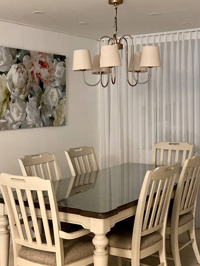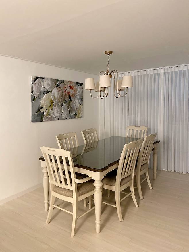 식탁은 6인용 확장 테이블로 구입했어요. 양쪽 끝에는 암체어로 구성되어있어서 쓰기가 좋아요.