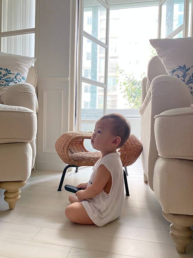돌 지나고 일어서서 걷기 시작하고, 혼자 티비 리모컨도 만지작하며 틀어보는 셋째에요. 평소에는 거실 가운데 놀이매트를 깔아놓고 지내요.