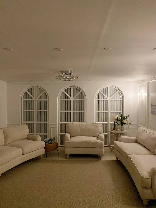 아치 쪽에는 아래쪽으로만 웨이스코팅을 넣어주었어요. 천장높이가 높아서 아치가 더 길어졌다면 너무 좋았을 것 같아요.