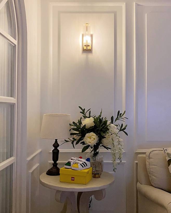 저희 집 포토존이랍니다. 다리라인까지 예쁜 사이드 테이블에 스탠드 조명이랑 플라워어렌지를 놓아주었어요.