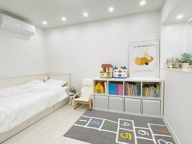 밑에 서랍을 빼면 아주 넓은 침대로 변신하는 아이들 침대는 6년째 방치 중이에요. 첫째, 둘째랑 사이좋게 저 침대에서 자는 날이 빨리 오면 좋겠네요. 바닥에 깔아준 러그는 우리가 어릴 때 많이 하던 놀이를 패턴으로 만들어 놓아서 너무 맘에 들었어요. 수납장의 아래쪽은 수납함으로 작은 장난감들을 정리해놓으면 깔끔해 보여요.