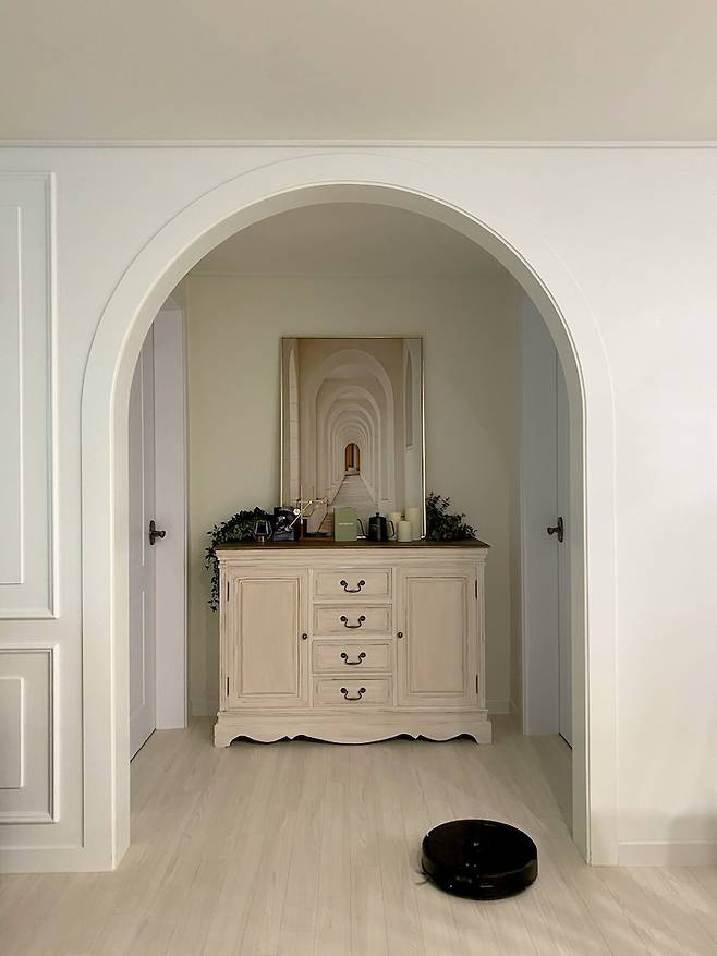 여기에도 아치가 있죠? 거울에 라운드를 주어서 집 분위기에 맞춰보았어요. 삭막하게 느껴질수 있는 컬러라 바닥과 윗쪽공간에 인조그린을 놓아주고 바닥은 베이지 톤의 러그를 깔아주어서 아이들이 편하게 들어올 수 있도록 건식으로 사용하고 있어요.