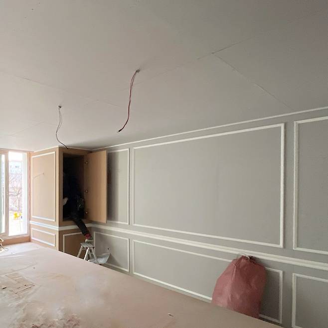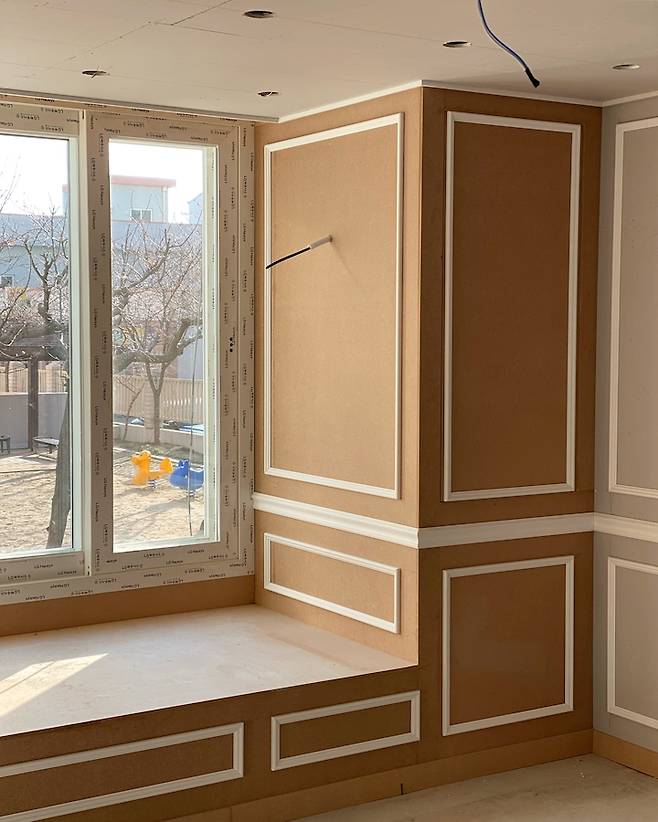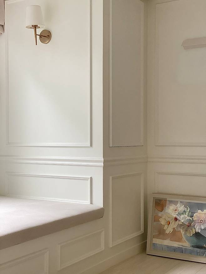 같은 두께의 몰딩으로 모두 하면 너무 심심할듯하여 허리 몰딩은 좀 더 묵직한 느낌의 두꺼운 걸로 선택했어요.