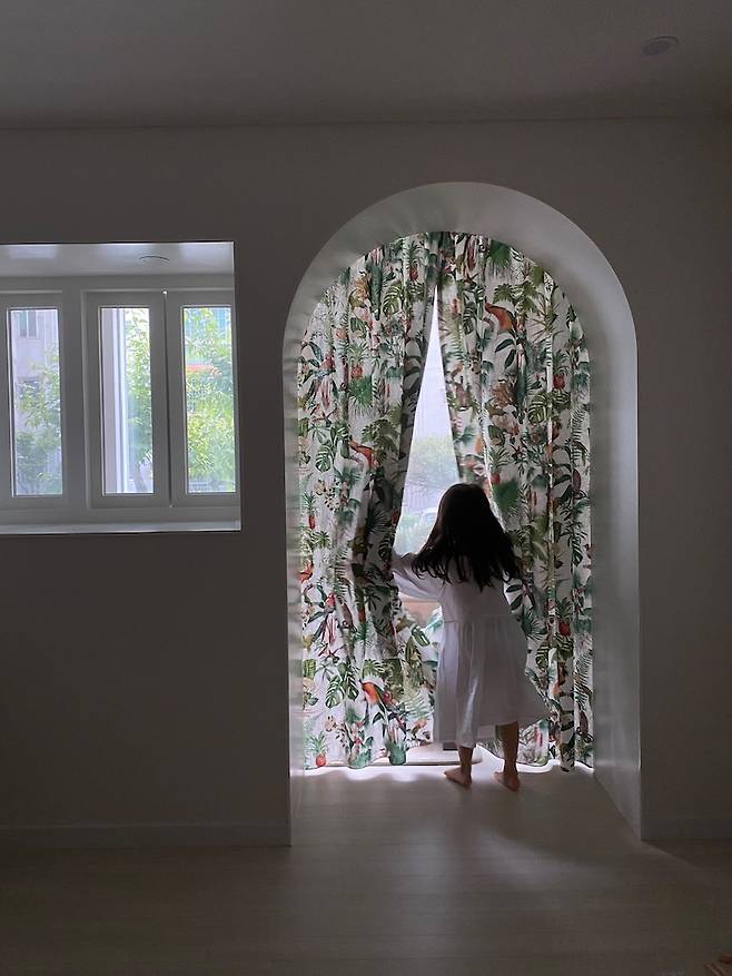 천장이 낮아서 시스템 에어컨 설치가 불가능했어요. 그래서 아치 쪽에 스탠드 에어컨을 놓아야했는데, 그렇게 일반적인 생각으로 결정했다면 이런 뷰는 나오지 않았겠죠?