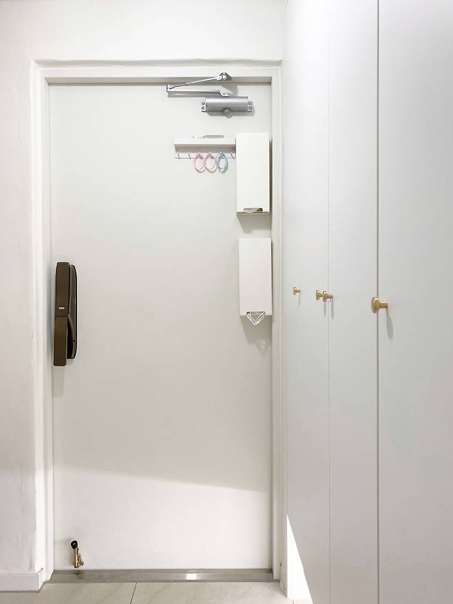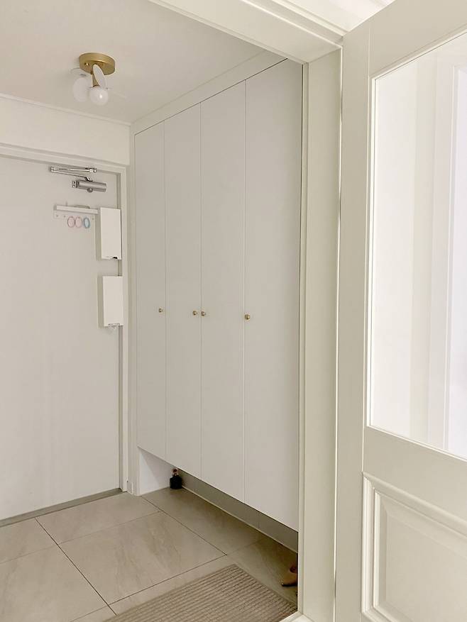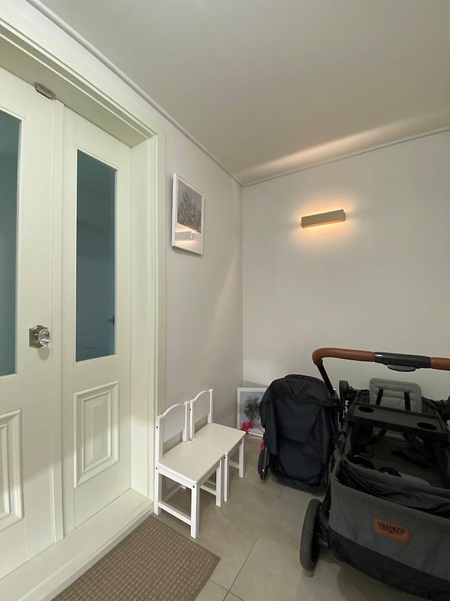 1층 엘리베이터 앞에 현관문이 있어서 유모차와 웨건을 놓을 공간이 없어요. 그래서 가장 작은방 안쪽의 수납장 공간을 현관 쪽으로 터서 현관 공간을 넓혔어요. 새로 만든 벽에는 심플한 조명을 설치해주었어요. 몇 년 뒤 유모차와 웨건이 현관에서 사라지면 더 예쁘게 꾸며질 예정이에요.