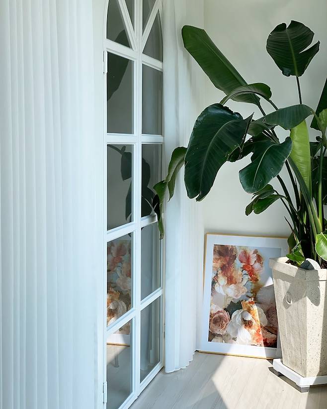 거실 아치문의 뒤쪽베란다는 우리 집의 유일한 진짜 식물도 놓았고요. 예쁜 액자와 커튼들이 있어요. 화분을 거실 안쪽으로 놓고 싶지만 우리 집 삼남매가 가만두지 않을 거예요.