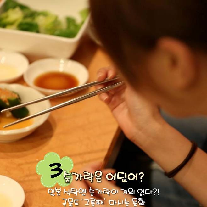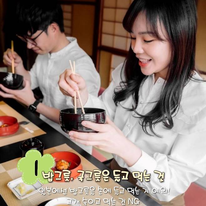 우리나라에서는 밥그릇이나 국그릇을 식탁에 놓은 채 숟가락으로 떠 먹는 것이 일반적이지만, 일본에서는 밥그릇과 국그릇을 손으로 들고 먹는 것이 기본 예절입니다.