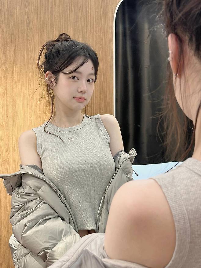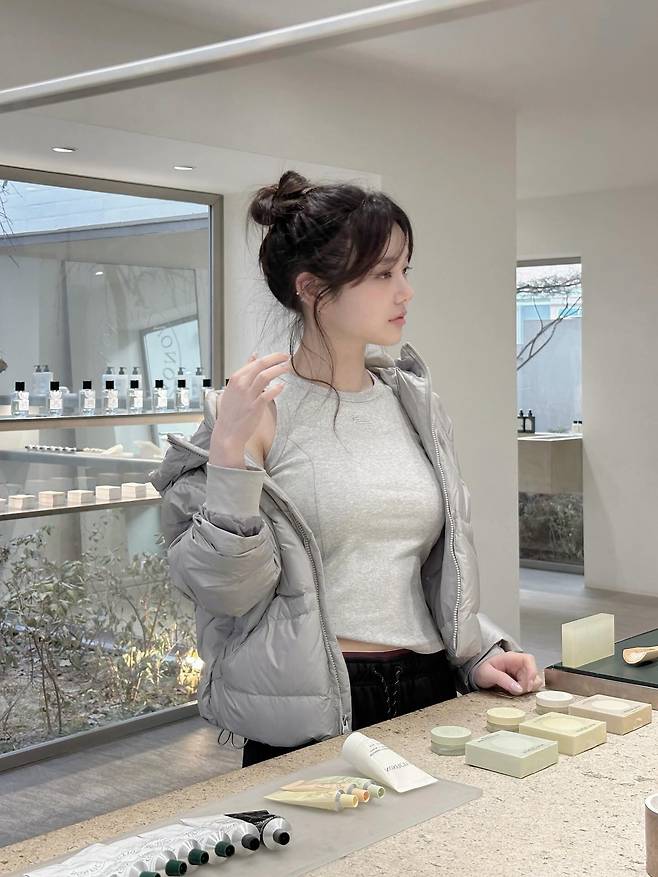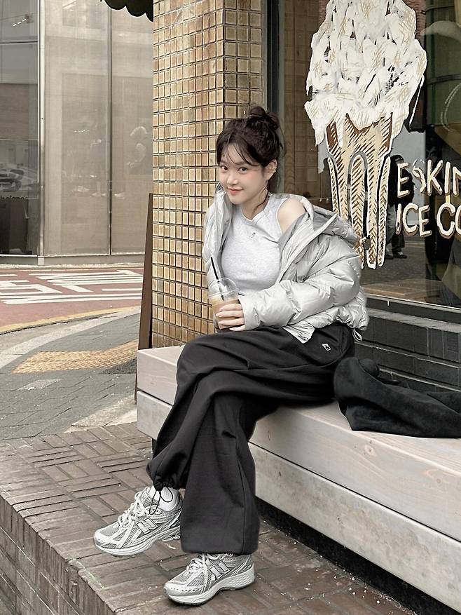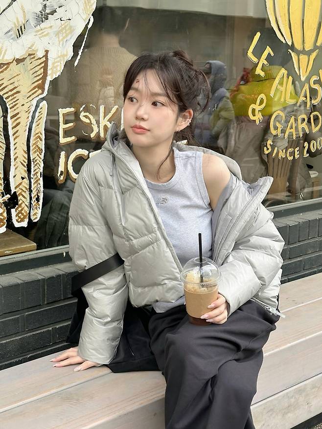 특히 패딩 한쪽을 자연스럽게 뒤로 젖혀 이너로 매치한 민소매 톱을 노출하는 연출법은 이유비 특유의 가녀린 어깨 라인을 돋보이게 하며 자유분방한 에너지를 발산합니다.