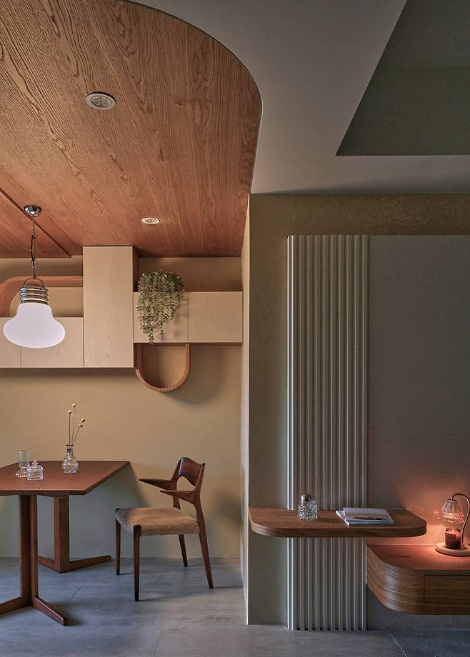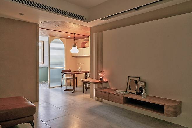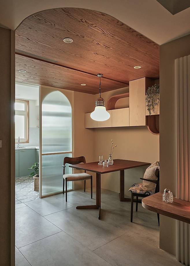 거실과 다이닝룸은 개방적이지만 각기 다른 분위기를 느낄 수 있도록 계획했습니다. 곡선 우드와 템바보드로 마감한 천장 포인트 아래, 원목 식탁과 빈티지 의자가 따뜻하게 자리합니다. 플로팅 선반은 장식과 조명을 동시에 배치할 수 있어, 낮엔 환하고 밤엔 은은한 무드를 연출합니다.