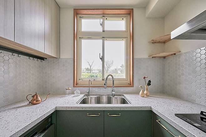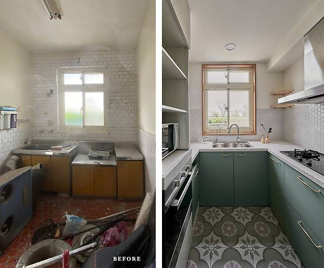 리모델링 전후 차이가 가장 큰 곳은 주방입니다. 낡은 타일과 가구를 철거하고, 바닥엔 패턴 타일로 생기를 불어넣었습니다. 톤다운 그린 싱크대 하부장은 차분함을, 골드 손잡이는 고급스러움을 더했죠. 실용성과 디자인을 모두 만족시키는 변화였습니다.