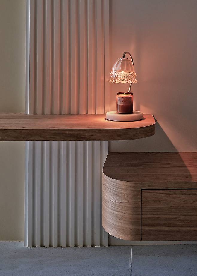 좁은 평수를 극복하기 위해 대부분의 수납은 벽면 맞춤 제작으로 해결했습니다. 서재엔 슬라이딩 도어와 오픈 선반을 혼합해 책과 소품을 정리했고, 방 일부는 보랏빛 페인팅으로 차분함을 더했습니다. 빈티지 러그와 조명이 공간에 온기를 불어넣어, 단순한 수납을 넘어 인테리어 요소로 승화시켰습니다.