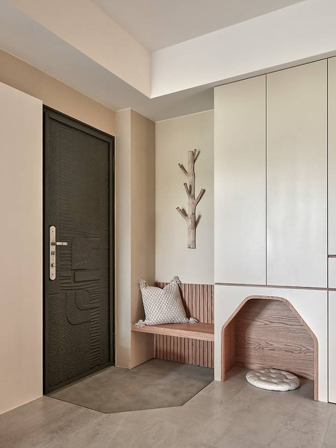 40년 된 20평 주택의 현관은 단순한 출입구가 아니라 ‘환영의 공간’으로 재탄생했습니다. 신발장과 옷장을 결합한 맞춤형 수납, 강아지가 주인을 기다릴 수 있는 현관벤치까지 설계해 기능과 감성을 모두 담았죠. 바닥 여백과 수직 활용으로 시야를 넓혔고, 빈티지 타일과 나뭇결 패널이 어우러져 따뜻한 첫인상을 완성했습니다.
