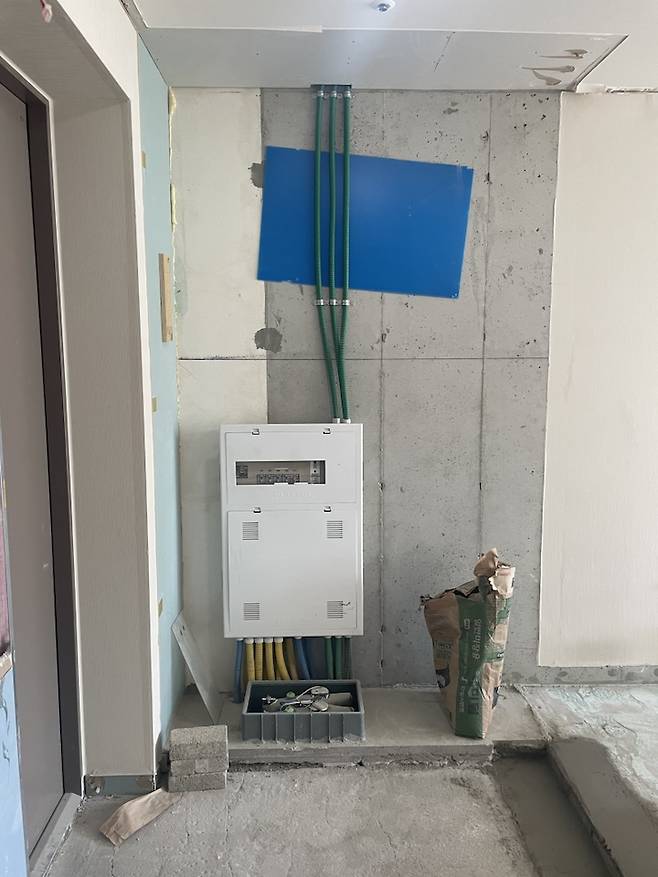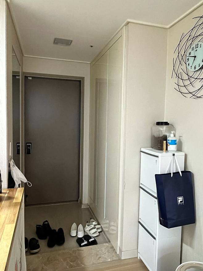 기존에 신발장이 자리하던 현관 왼편에서 철거 작업 이후 전기 분전함과 수도 계량기가 발견되는 바람에 디자인 실장님께서 이 골칫덩이들을 어떻게 가릴 수 있을지 고민하느라 꽤나 애를 먹으셨답니다 ㅠㅁㅠ