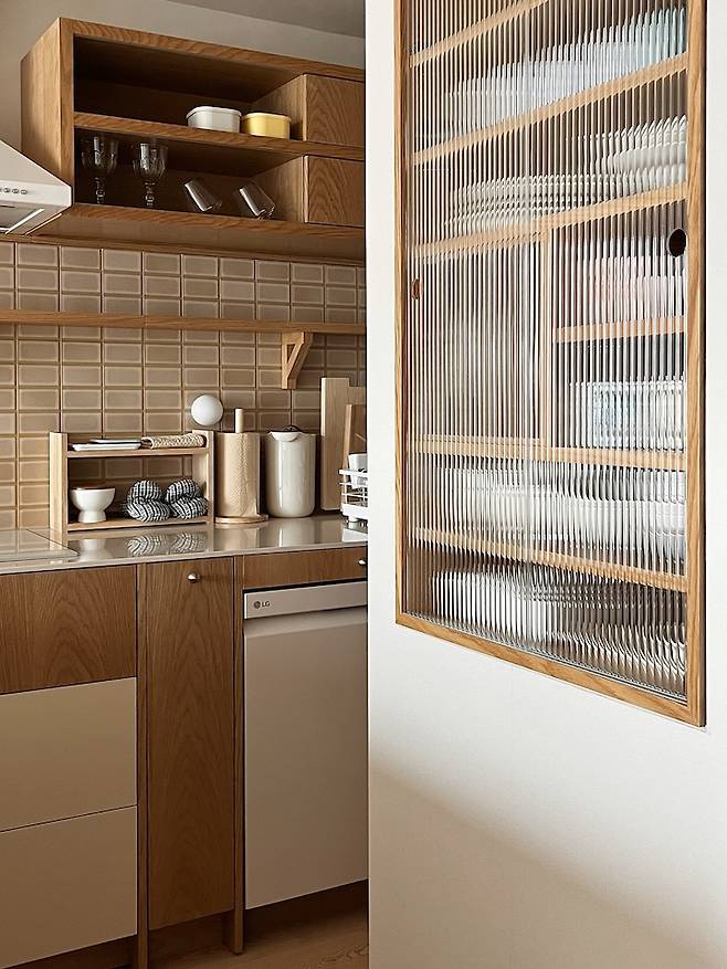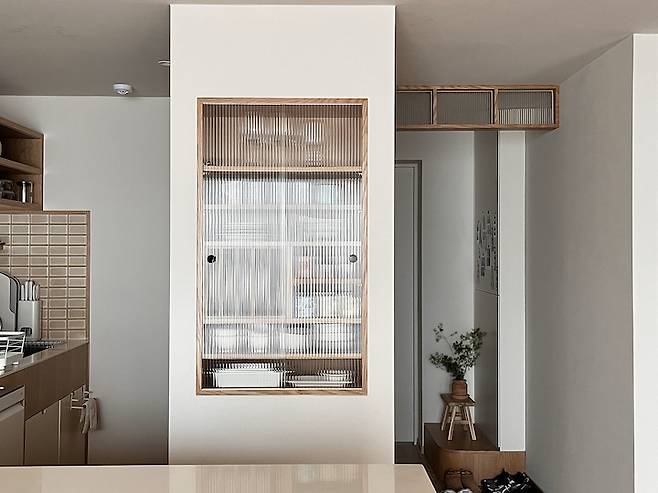현관 상부의 모루 유리 파티션과 결을 똑같이 하고 있는 주방의 모루 유리 벽장도 제가 너무나 애정 하는 포인트 중 하나인데요. 수납공간이면서 각종 식기들의 실루엣이 슬쩍 보이는 것만으로도 미학적인 효과는 낸다는 게 정말 신기해요.