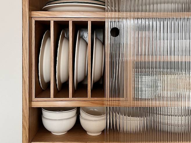 넓은 파스타 플레이트부터 밥공기와 찬기까지 야무지게 수납할 수 있도록 칸별로 높낮이가 적절히 구성되어 있어요.